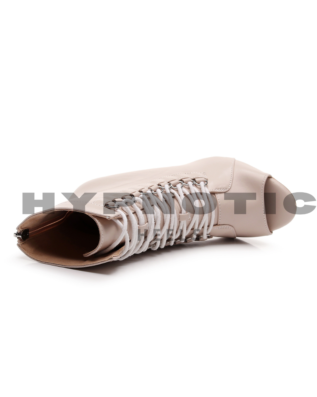 This premium beige vegan leather shoe boasts vegan leather that will soften and mould to your foot, unique eyelets for secure lacing and cute design, reinforced ankle support, plush memory foam padding, and a flexible yet stable sole. This versatile heel will become your go-to footwear for the studio, dinner, or a night out. Experience both comfort and style with this must-have heel.